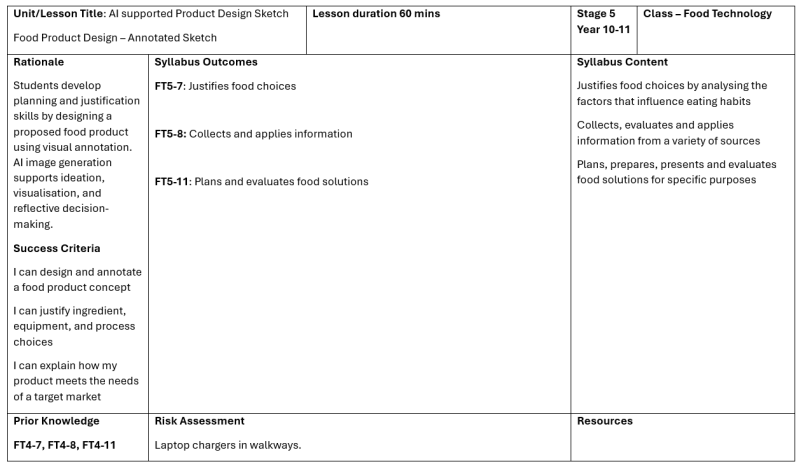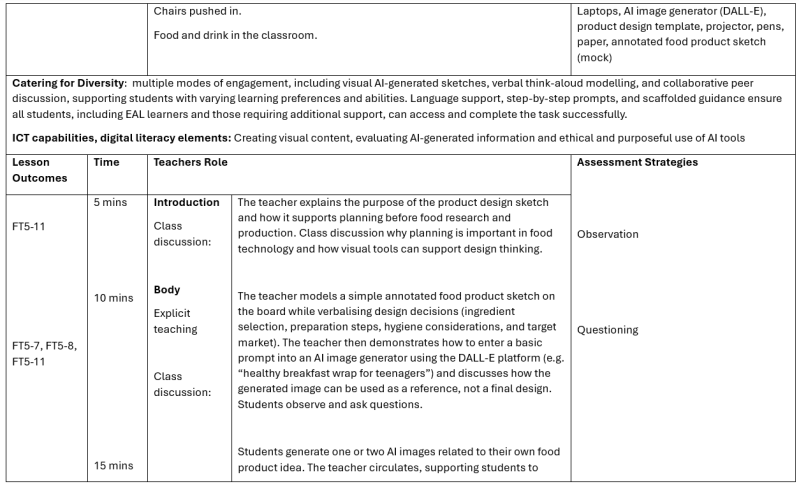 AI image generation tools such as DALL-E are used in this lesson to support students’ planning and ideation during the product design phase. Rather than replacing creativity, the AI tool functions as a visual stimulus that helps students explore possibilities for food preparation, ingredients, and target markets. This aligns with contemporary perspectives on educational technology that emphasise augmentation of learning rather than automation (O’Brien, 2017; Sanders & George, 2017).
