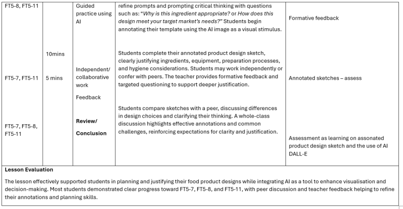 Using AI-generated images supports assessment as learning, as students critically evaluate and annotate their design choices, justifying why certain elements are appropriate or inappropriate for their proposed product (Black & Wiliam, 2009). This process strengthens outcomes FT5-7, FT5-8 and FT5-11 by encouraging reflection, evidence-based decision making, and planning. The think-aloud and annotation strategies ensure cognitive processes are made visible.