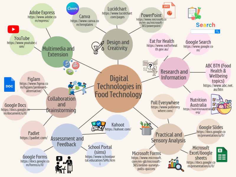 When approaching the concept map task, I began by identifying the key learning contexts within Food Technology, including theory-based learning, practical and sensory analysis, collaboration, assessment and multimedia presentation. From this starting point, I selected digital tools that aligned with these contexts and reflected the realities of my classroom practice. Rather than choosing technology for its novelty, I prioritised tools that could support purposeful learning, students’ engagement and assessment.